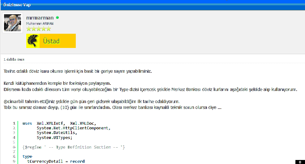 KurBilgisi := MerkezBankasi_KurVerisi( 'USD', now);
